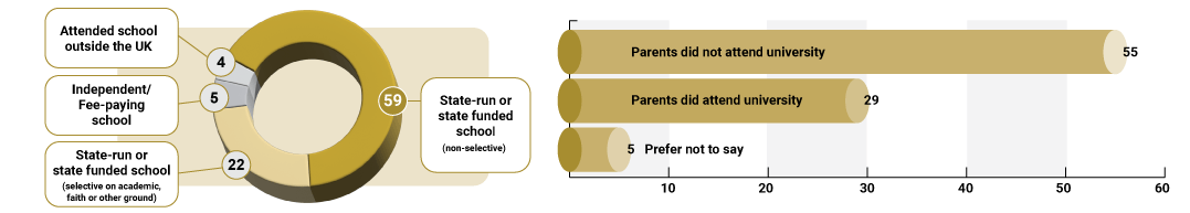 83% of staff said that they were heterosexual, with 10% being gay or lesbian or bisexual. 59 staff members went to a UK state-run or funded school, with only 4 going to a UK independent school – as highlighted in the pie chart below.