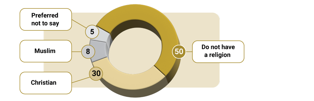 50 staff members declared that they did not have a religion, compared to 30 Christians, 8 Muslims, and 5 preferred not to say.
