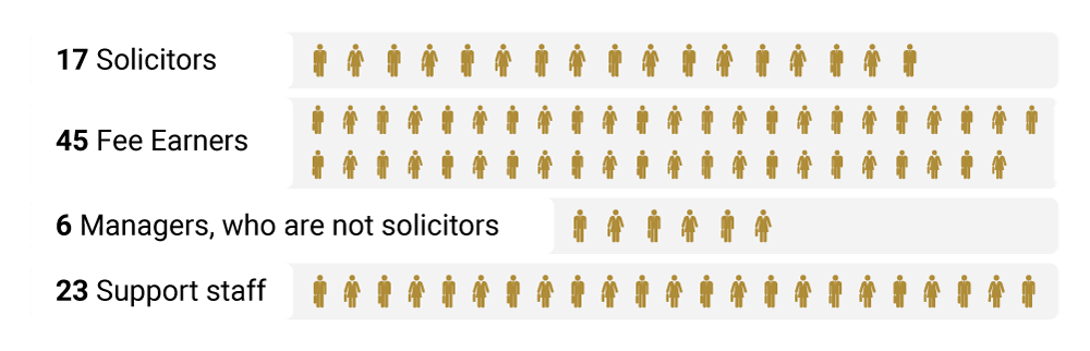 We presently have 17 Solicitors, 45 fee earners, 6 managers who are not solicitors and 23 staff in a supporting role such as admin, new claims, accounts and marketing.